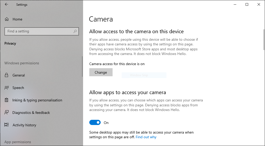 Stellen Sie sicher, dass die Option "Apps den Zugriff auf Ihre Kamera erlauben" aktiviert ist.