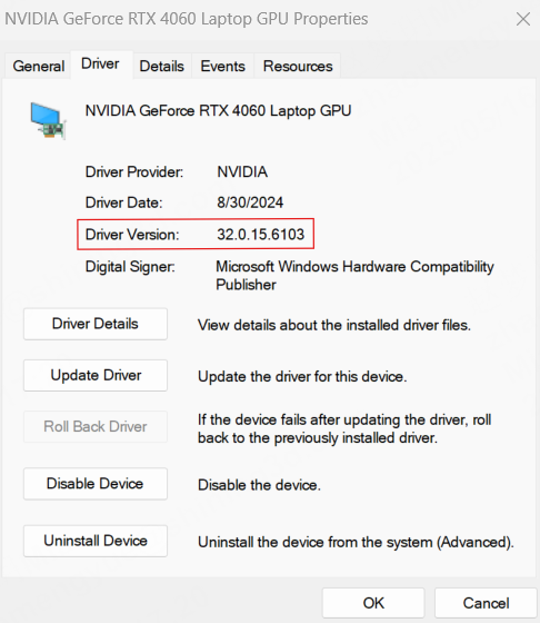 In the Properties window, switch to the Driver tab. You will see the currently installed driver version number next to Driver Version.