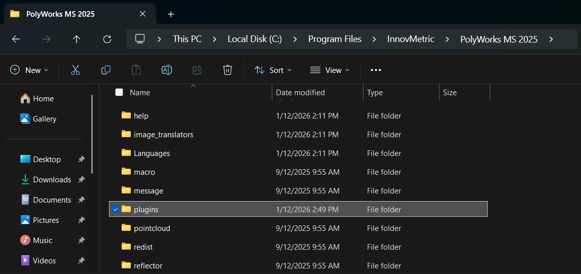2. Go to PolyWorks installation directory, find the plugins folder: C:\Program Files\InnovMetric\PolyWorks MS 202x\plugins