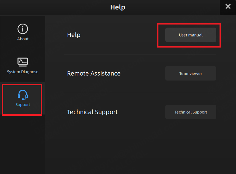 Alternatively, users can locate the question mark icon within our OptimScan software, click on it, and select the [Support] option to access the user manual.