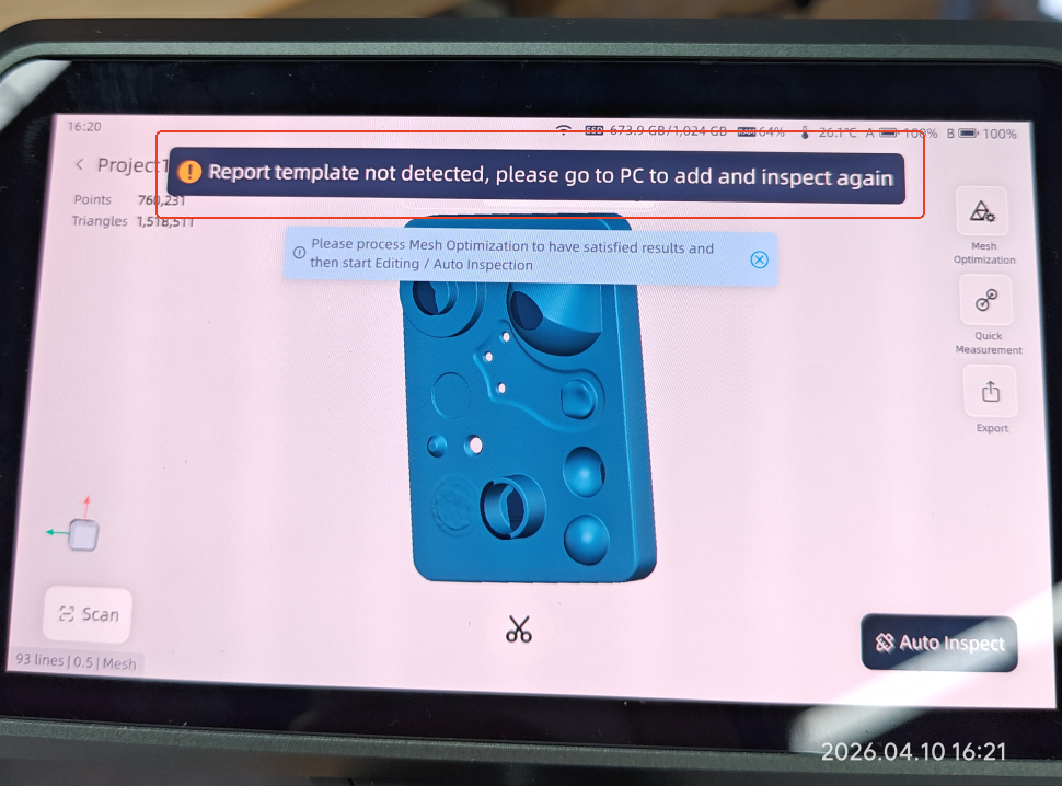 - Run the Auto Inspect function again. The device should now successfully detect the template and generate the report without error.